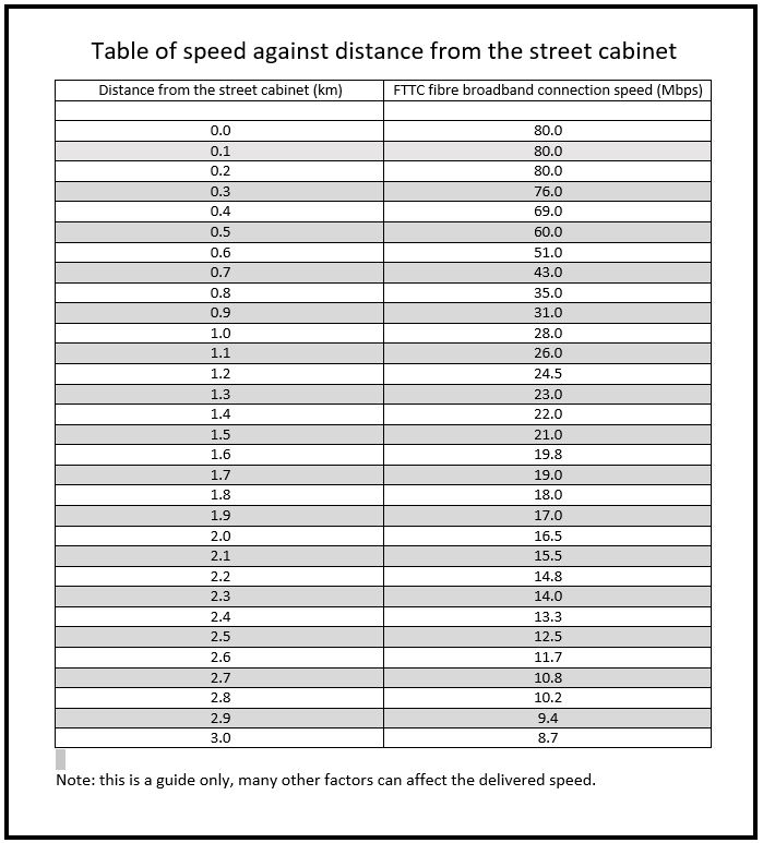 The closer to this cabinet the higher the possible speed, in theory up to about 80Mbps (Mega bits per second). See graph at the foot of this page for an estimate of possible speed available at your location.